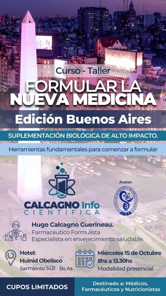 El miércoles 15 de octubre próximo, de 8.00 a 13.30 horas se realizará en la Ciudad de Buenos Aires el curso-taller “Formular la Nueva Medicina, suplementación biológica de alto impacto”, a cargo del reconocido profesional Hugo Calcagno Guerineau, farmacéutico formulista, especialista en envejecimiento saludable y director del Laboratorio Calcagno, de la ciudad de Tucumán.